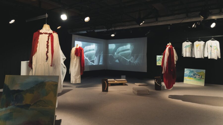 今回は、私たちが昨年秋に静岡県原泉地区にて滞在制作し、上演した『風景によせて2021 はらいずみ もやい』を取り上げ、出演者が着用した衣装、現地の木材を使って製作した客席(丸太椅子)、現地で生み出された絵画や音楽、記録映像や生活の様子に至るまで、私たちが上演までに積み重ねてきた創作プロセスを展示します。