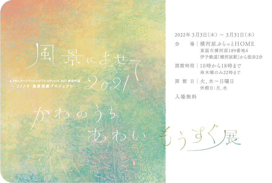 3月3日(木)からおよそ1ヶ月の間、東温での滞在制作やこれまでのソノノチの風景演劇の歩みを展示する「『風景によせて2021 かわのうち あわい』もうすぐ展」を開催します🌸 伊予鉄道 横河原駅近くの「横河原ぷらっとHOME」の一角にて、今月末の...